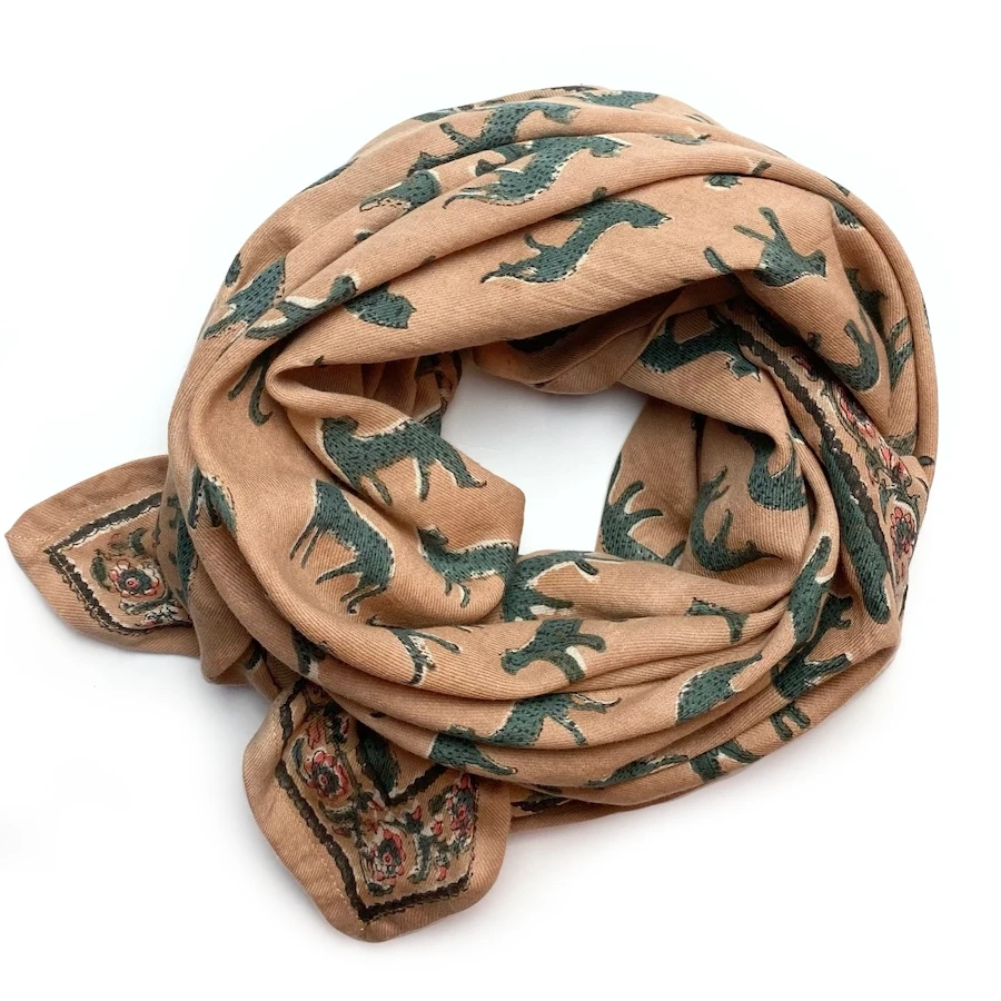 - Conseil d’entretien : En raison du procédé de teinture naturelle utilisé, les foulards peuvent déteindre par frottements sur d’autres matières. Nous vous recommandons de les laver à 30° programme délicat seuls ou avec des coloris similaires avant de les porter pour la première fois.
