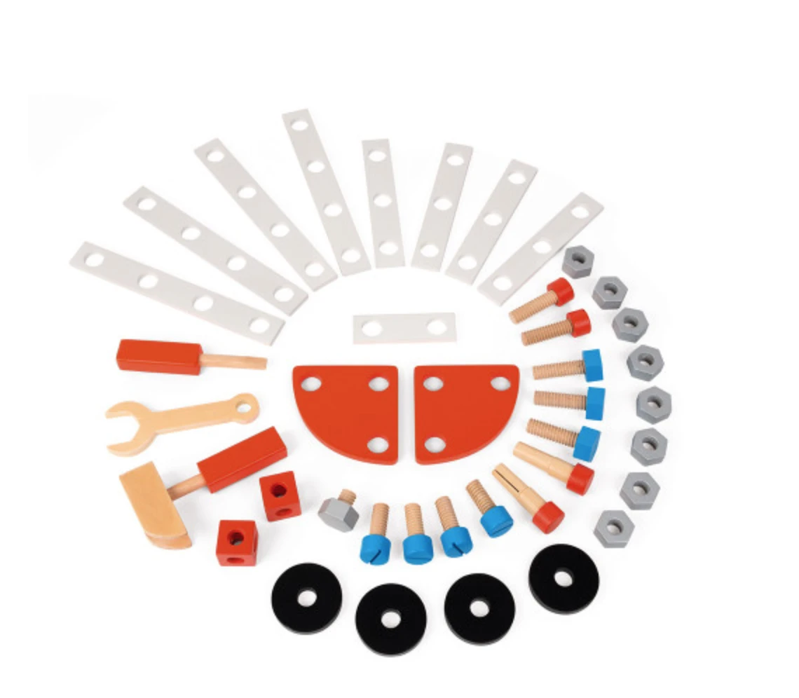 - Comprends : 3 outils magnétiques (clef, marteau et tourne-vis), étau, 40 accessoires (boulons, écrous, vis, rondelles et plaquettes), horloge, tableau ardoise, fiche de construction pour une voiture de course, étagère de rangement et plan de travail avec trous pour visser, assembler et créer à volonté