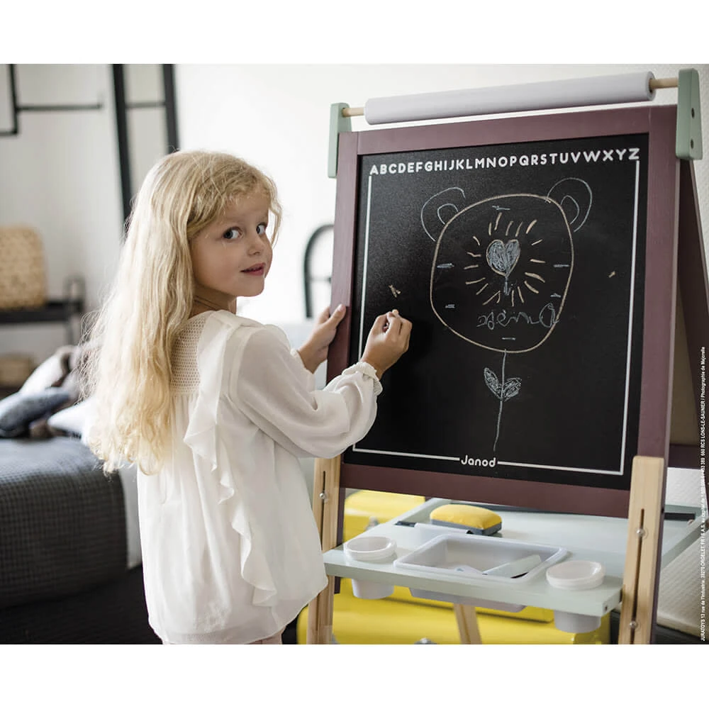 CONTIENT : 1 face ardoise, 1 face pour feutres effaçables magnétique, un rouleau pour peinture et dessin, 6 magnets, 10 craies, 1 feutre effaçable à sec, 1 effaceur et 1 règle aimantée