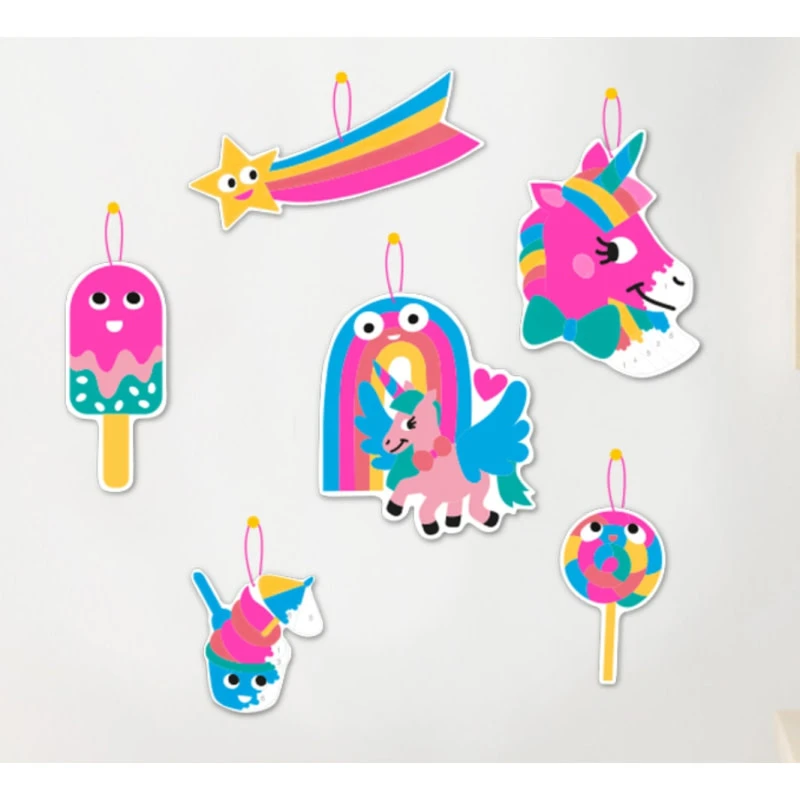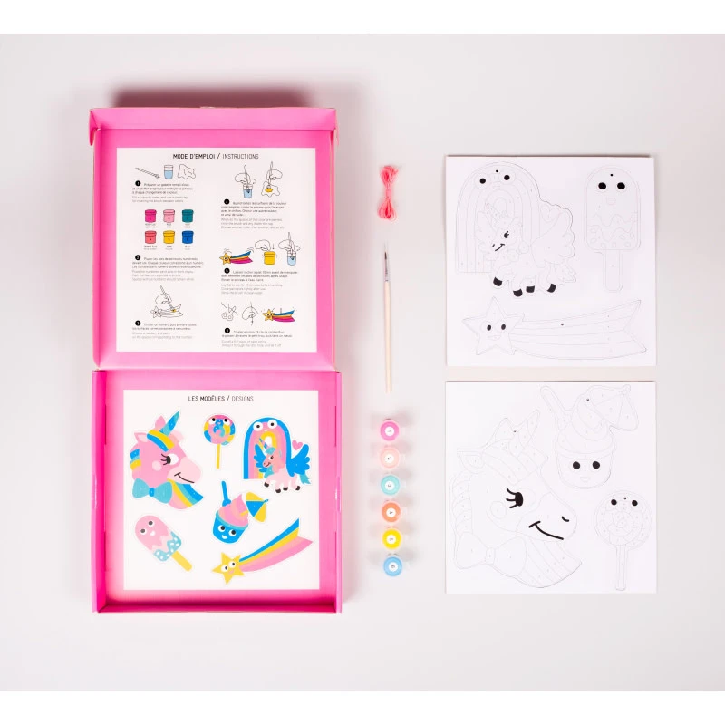- Contient : 6 décorations prédécoupées (Baton de glace, Etoile filante, Licorne, Arc-en-ciel, Crème glacée, Lollipop) sur 2 planches cartonnées 24 x 24 cm, 1 pinceau, 6 pots de peinture acrylique dont 2 couleurs fluo, 1 cordon à découper et 1 boite de rangement avec instructions
