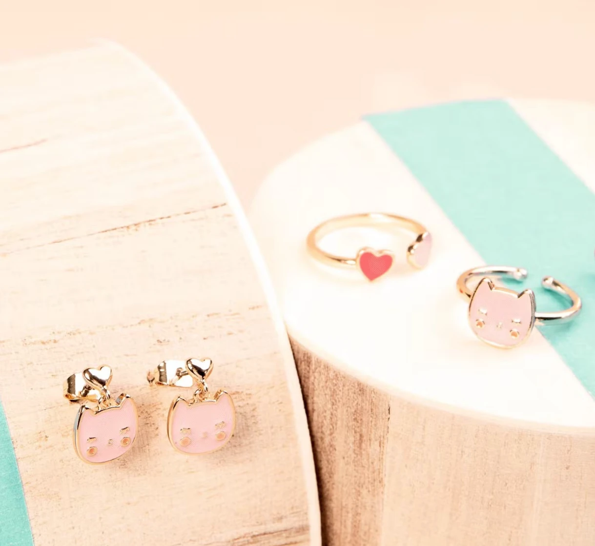 - Boucles d’oreilles chat en laiton doré et émail de couleur rose