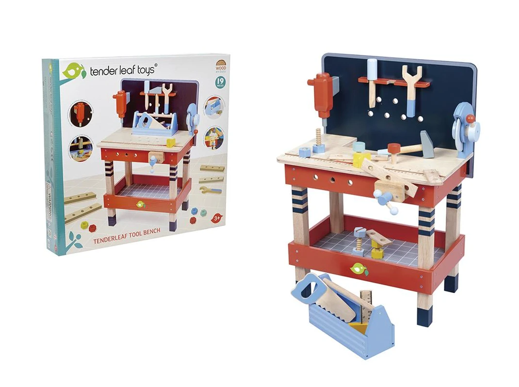 - Comprend : 1 boite à outils, 5 outils (clef, marteau, tournevis, équerre, scie et perceuse), 1 étau, 1 scie circulaire, des écrous, vis et plaquettes, 1 tablette de rangement et 1 plan de travail avec trous pour visser, assembler et créer à volonté