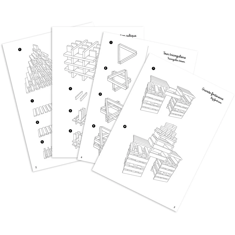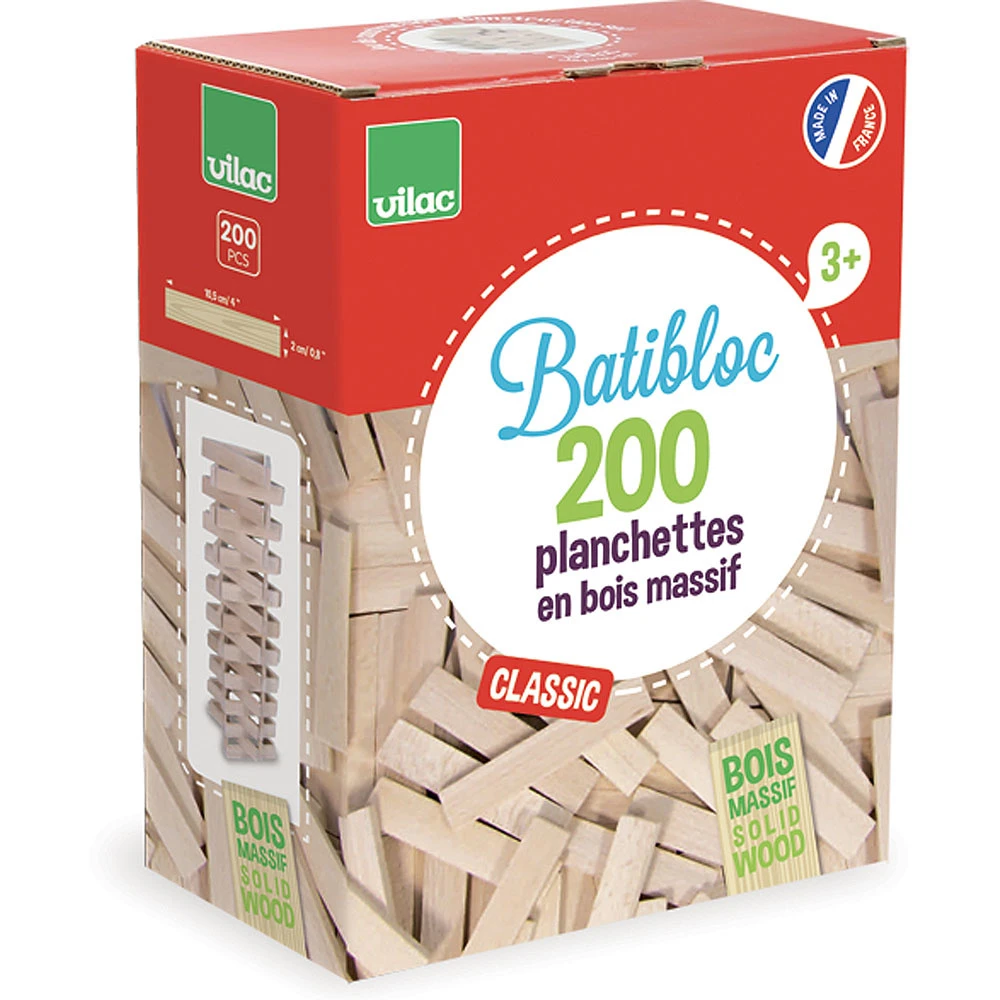 - Contient : 200 planchettes en bois massif naturel et plan de construction